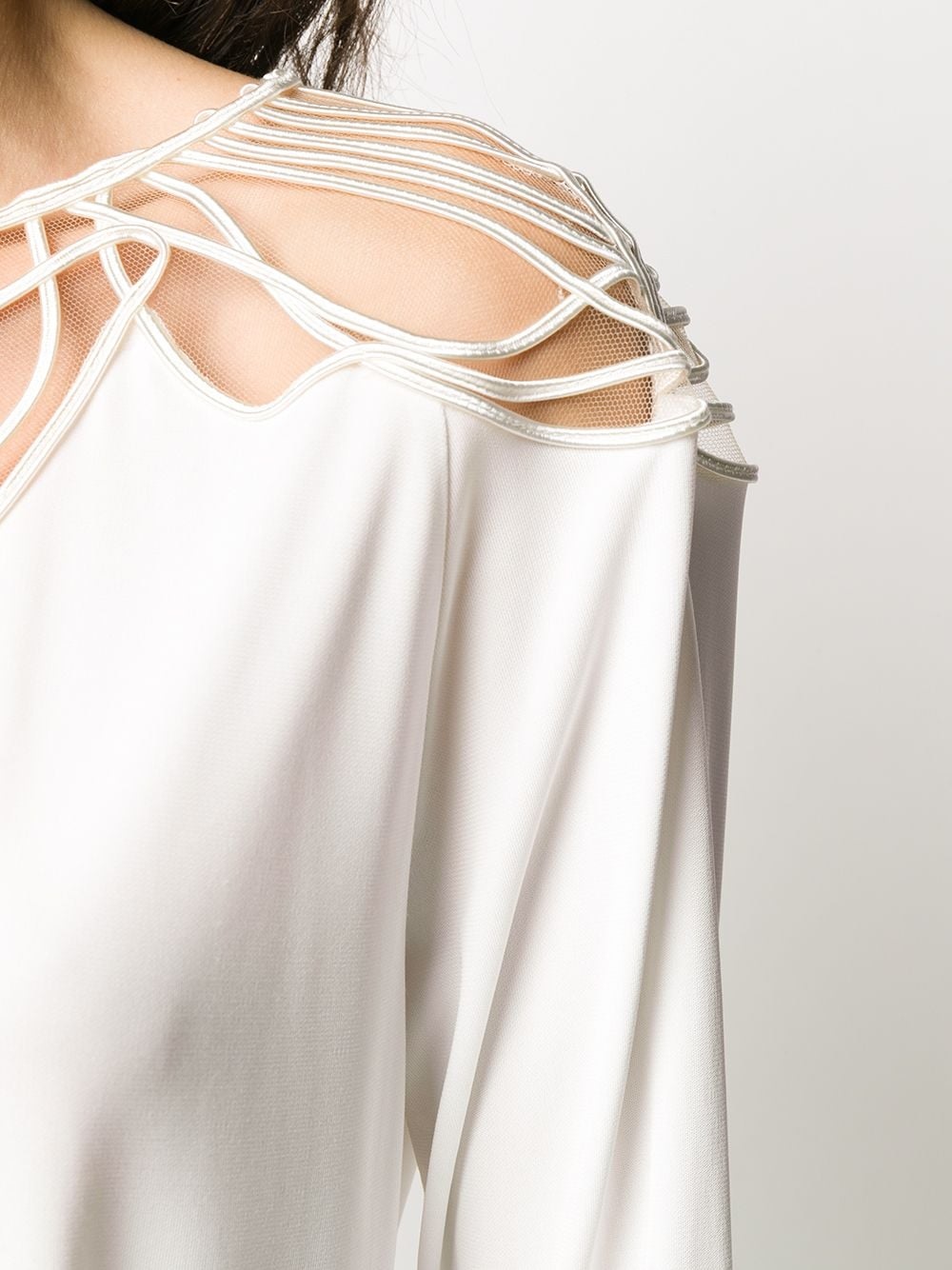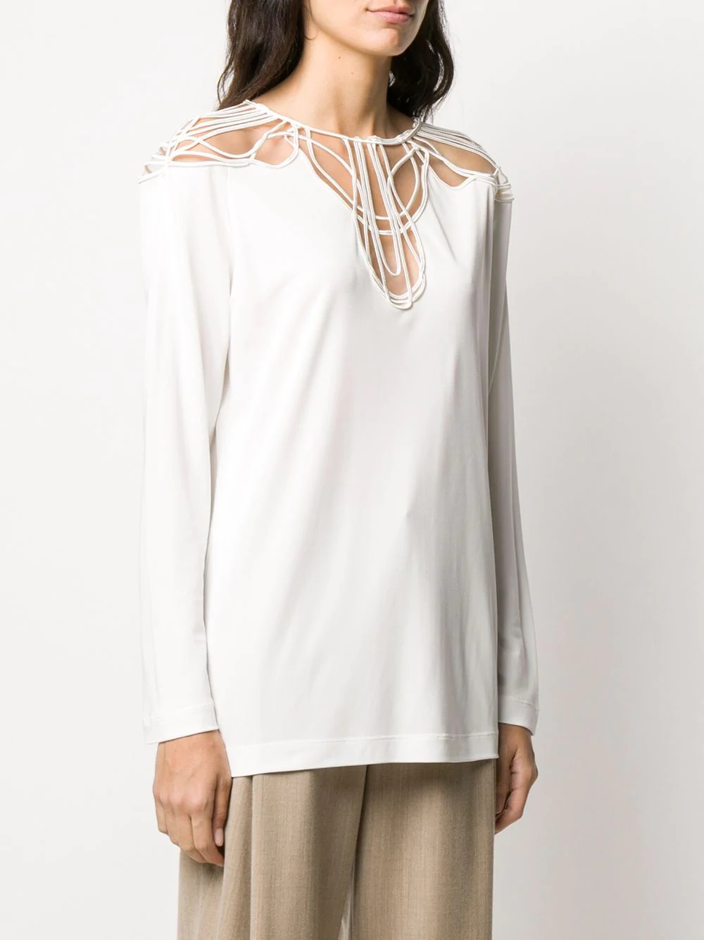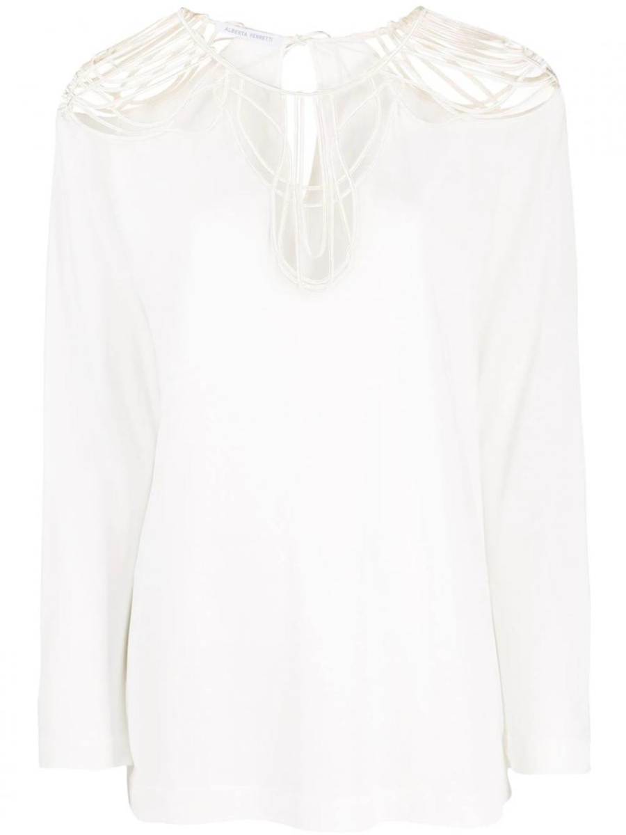 Блуза с длинными рукавами и прозрачными вставками от Alberta Ferretti. Прозрачные панели, круглый вырез, прорезь на спине, длинные рукава, свободный крой и прямой подол. Цвет: белый.