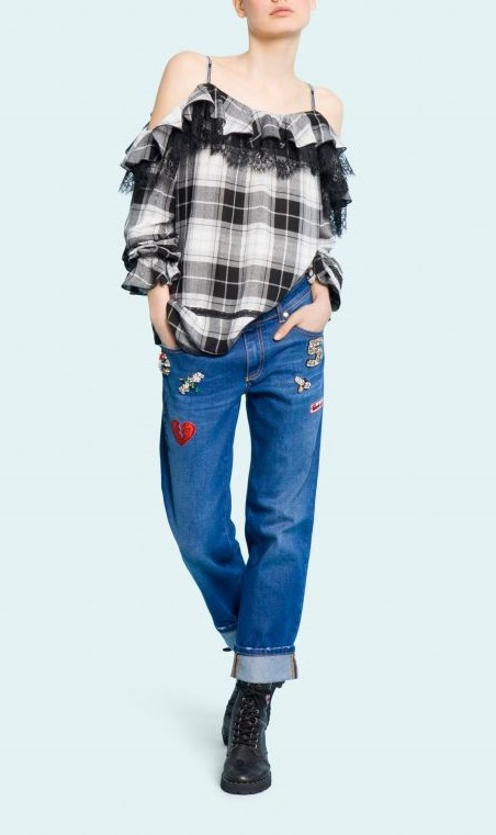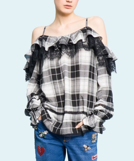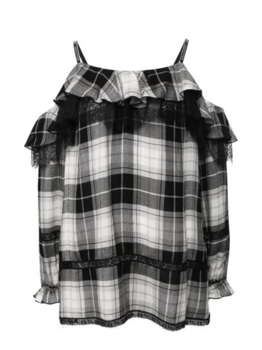 Кофта женская в клетку на тонких бретельках, отделка кружевом и рюшами. Модель с открытыми плечами.