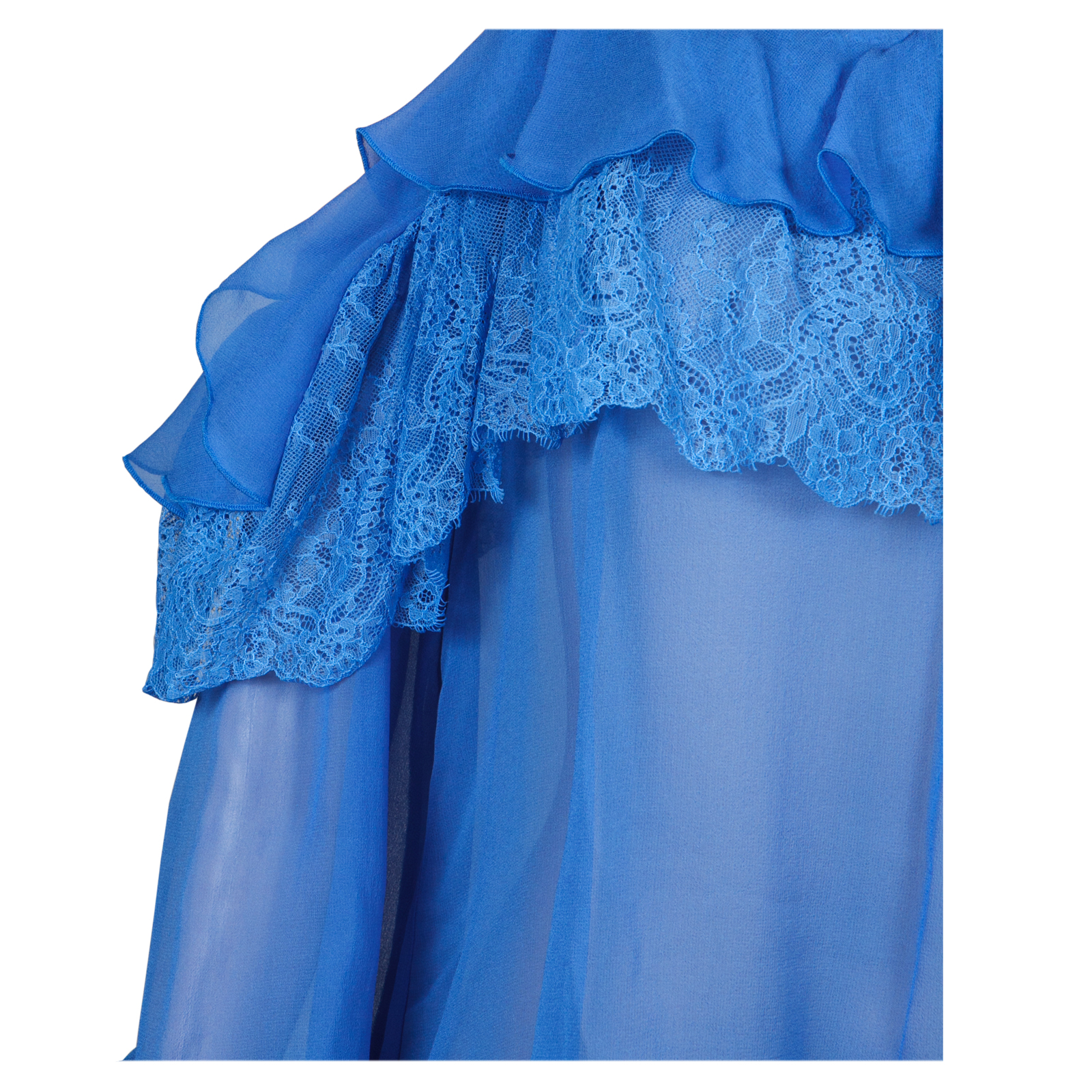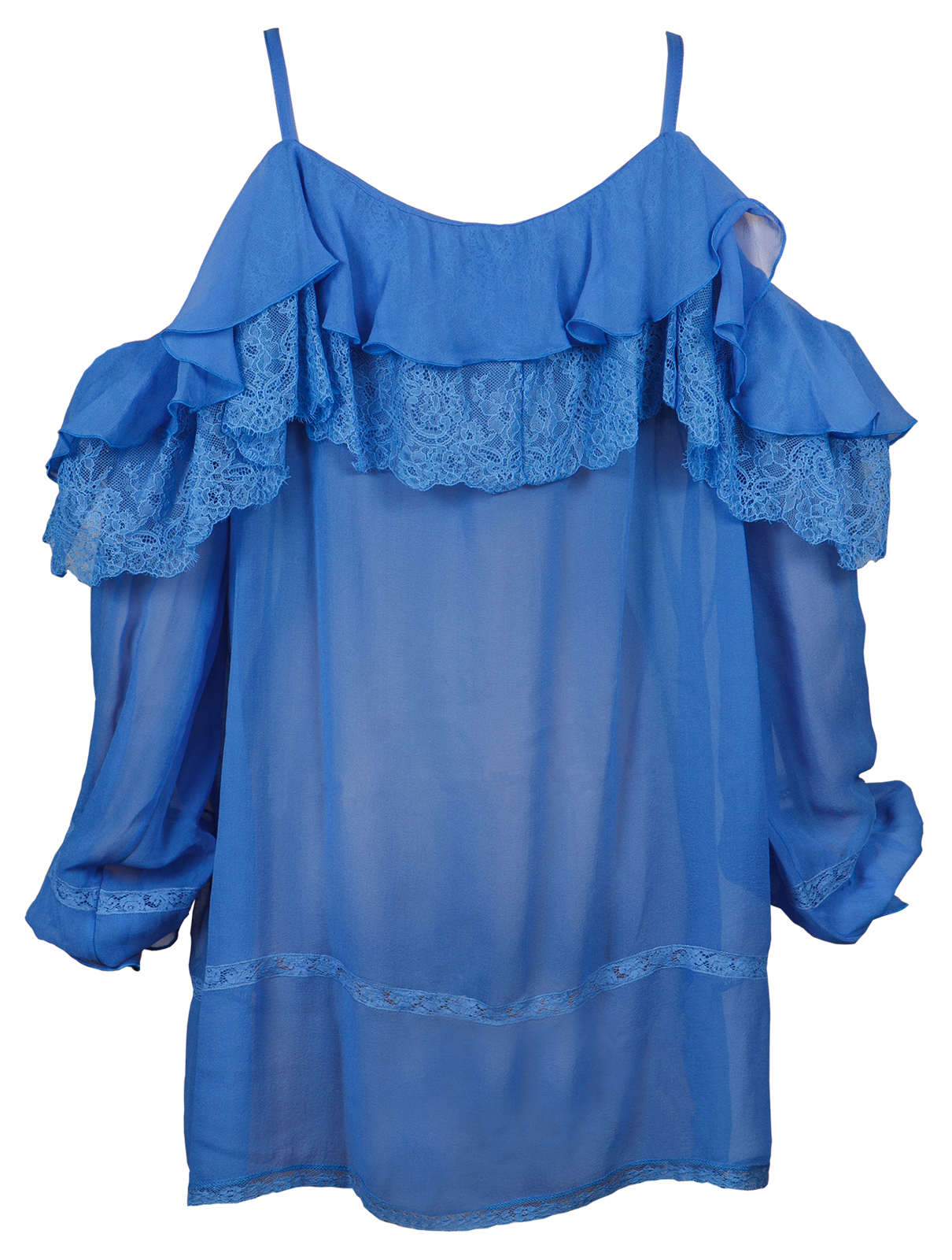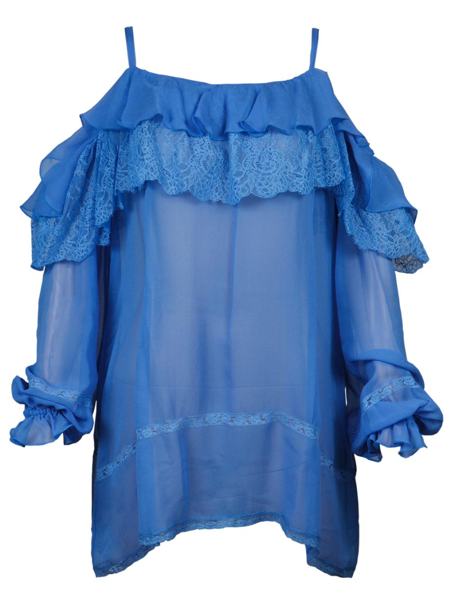 Блузка женская свободного кроя, отделка кружевом и рюшами. Модель с бретелями и открытыми плечами.