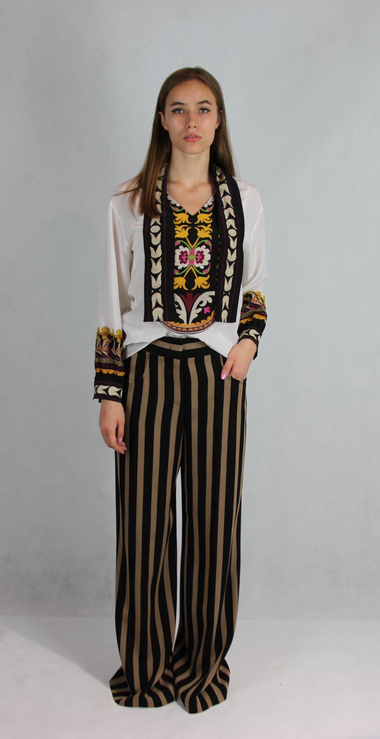 Блуза женская прямого покроя с V-образным вырезом. Длинный рукав.