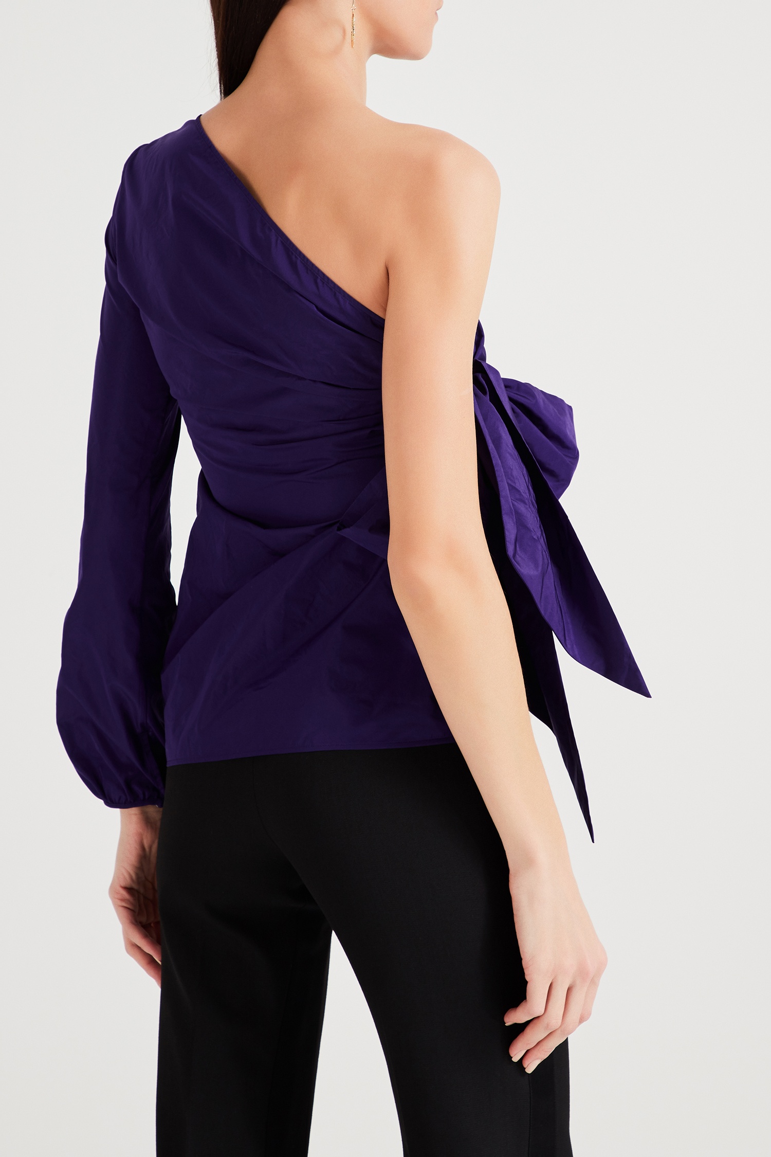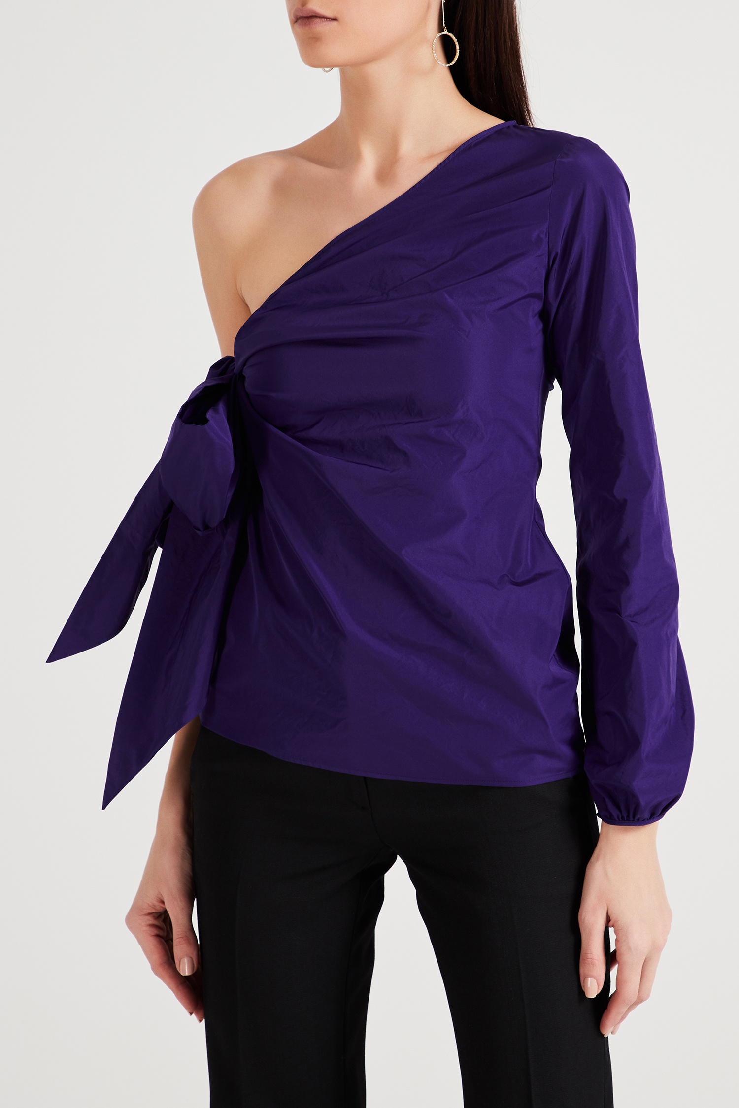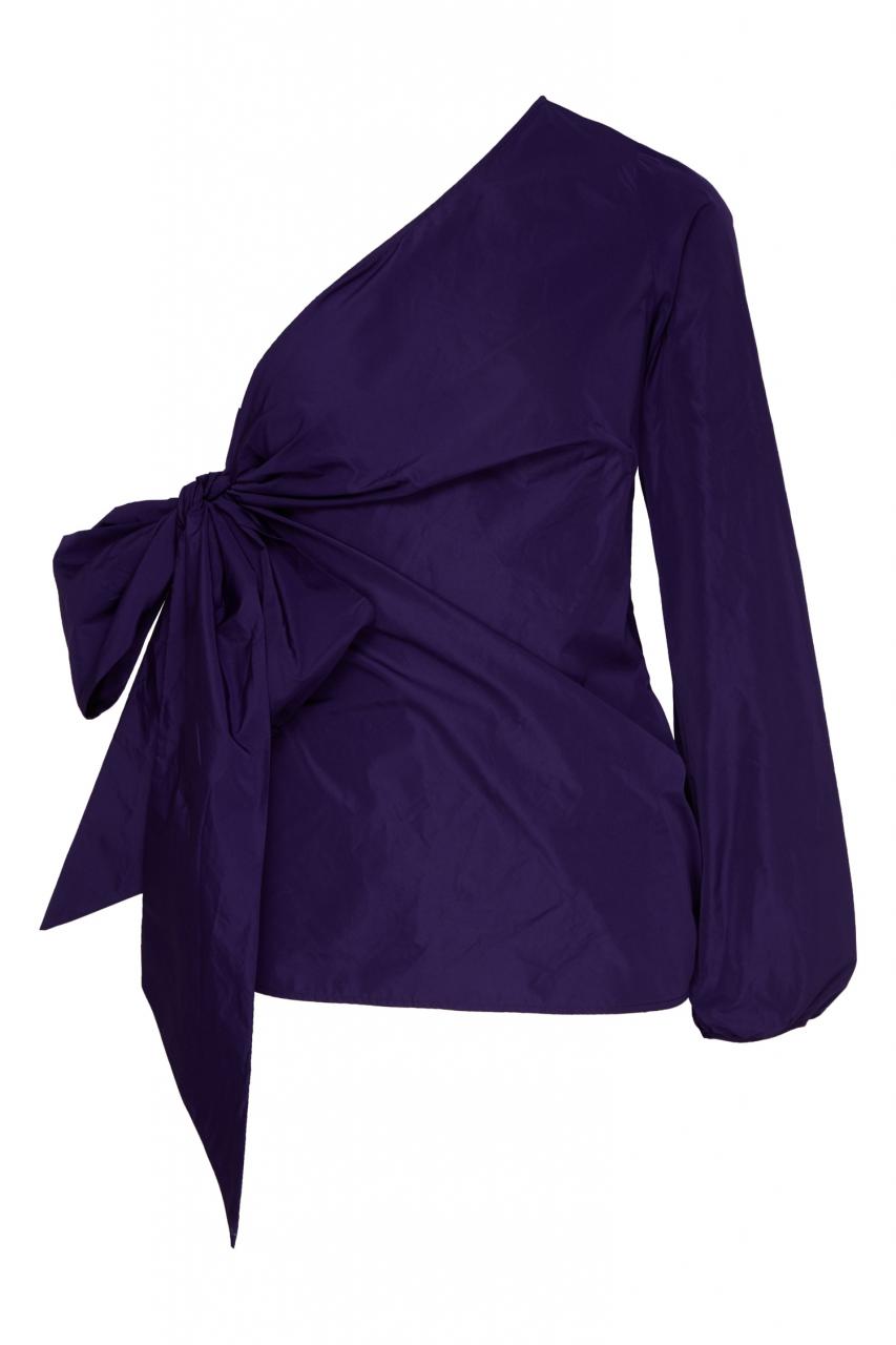 Блузка с бантом и одним рукавом от Nº21. Модель на одном плече, бант и драпированные детали. Цвет: фиолетовый.
