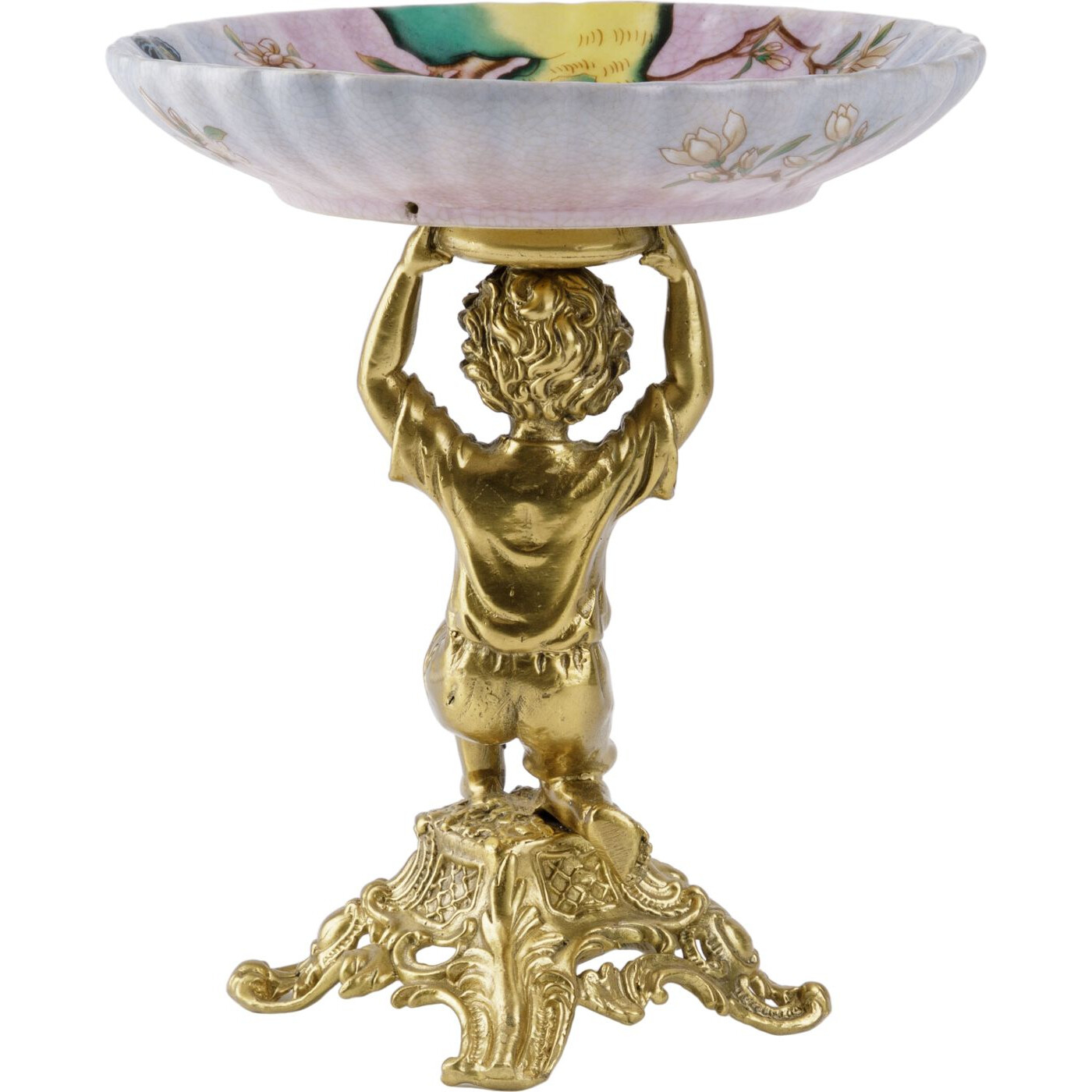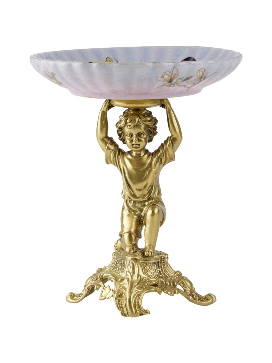 Чаша на ангеле, выполненная из фарфора с бронзовыми элементами. Уникальное изделие ручной работы. При производстве этих художественных изделий из фарфора с бронзой используются вековые традиции китайских мастеров. Видимые трещинки (кракелюры) делаются по уникальной технологии, что придает более благородный вид старинного изделия.