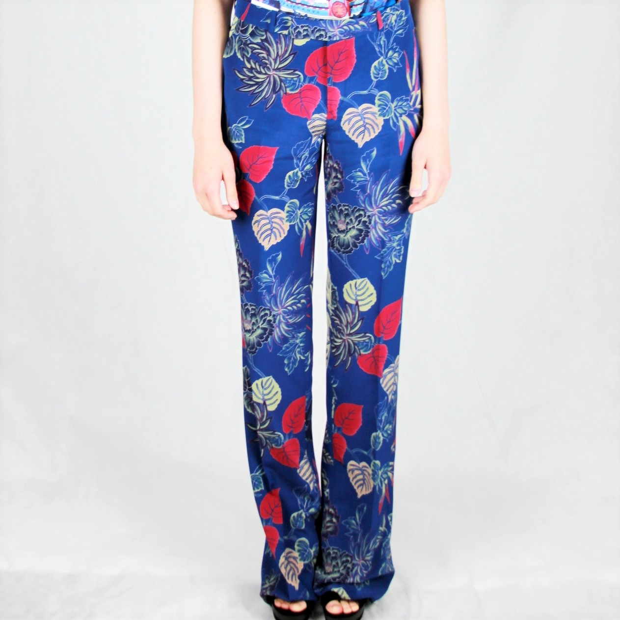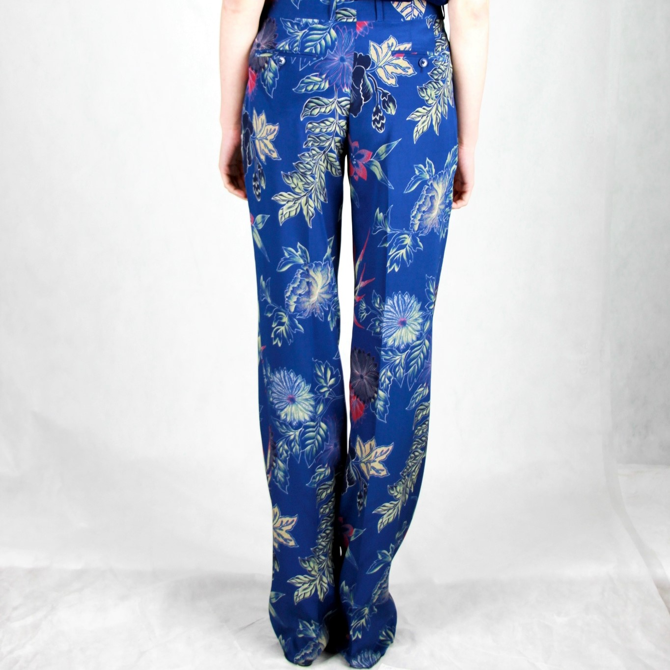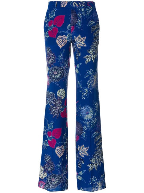 Синие шелковые широкие брюки с цветочным принтом от Etro (Этро). Петли для ремня, ширинка на крючке и молнии, прорезные карманы по бокам, два задних прорезных кармана на пуговицах, строгий крой, удлиненная модель.