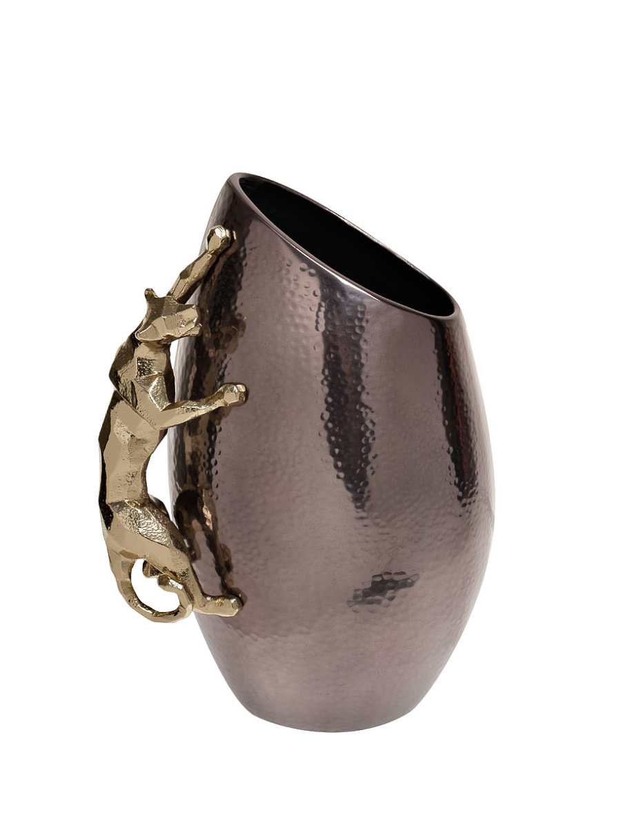 Декоративная металлическая ваза «Ягуар» не просто предмет интерьера, который можно поставить на стол и забыть. Черная с золотом ваза приковывает взгляд, очаровывает и добавляет интерьеру выраженной индивидуальности. Это вполне самодостаточный декор, который эффектно смотрится как соло, так и в компании букета цветов. Ваза из высокопрочного стекла и алюминия выполнена в лучших традициях стиля ар-деко. Эксклюзивности ей придает металлическая фигурка ягуара. Ваза отличается безупречным качеством исполнения, превосходно смотрится в классических и современных интерьерах.