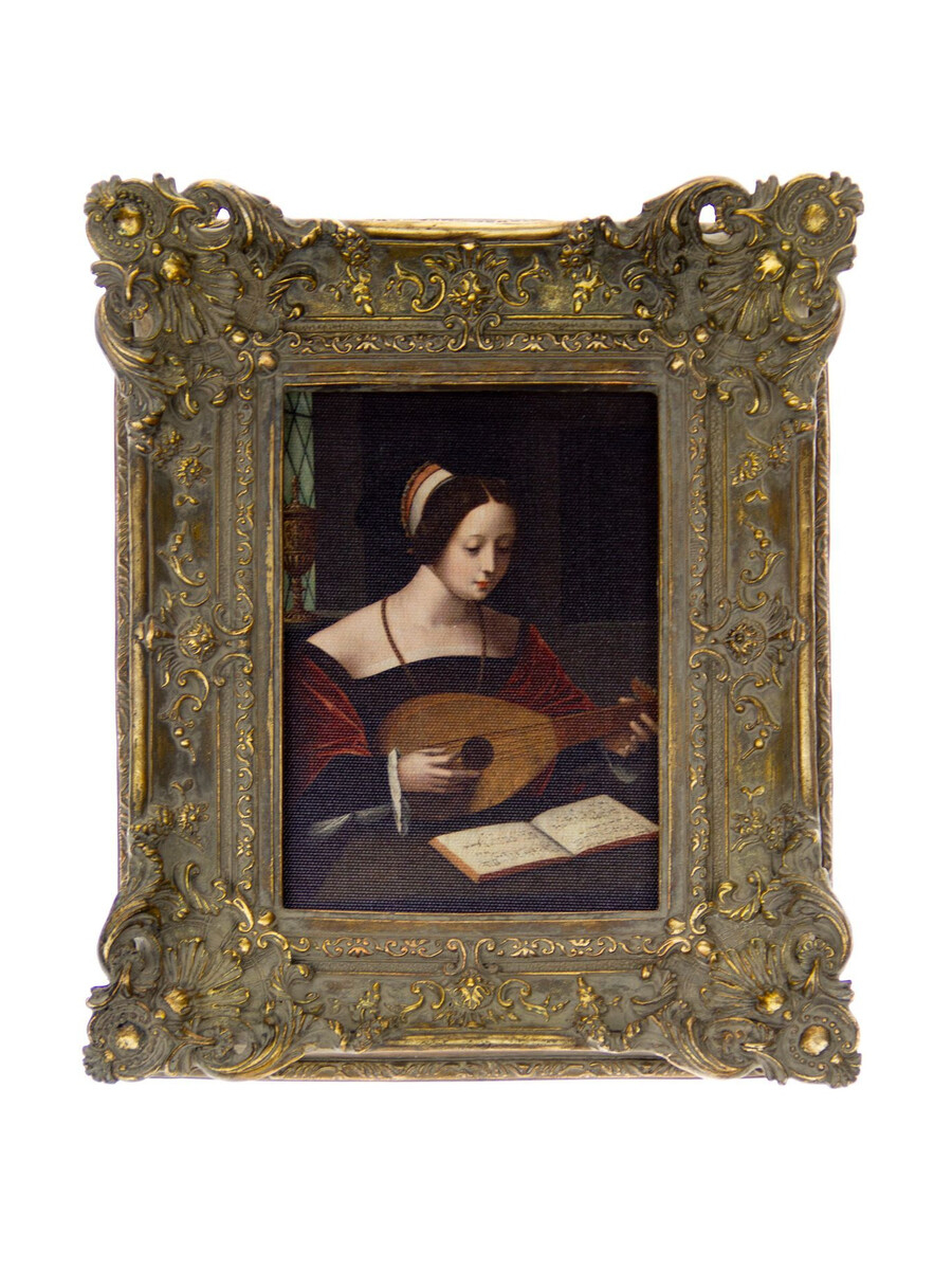 Неподражаемая интерьерная картина с роскошным багетом под старину, с изображением Св.Марии Магдалины с лютней. Это изделие украсит любой интерьер и придаст уют вашему дому, создавая уникальную композицию сочетанием нескольких предметов. Изделие имеет признаки искусственного состаривания.
