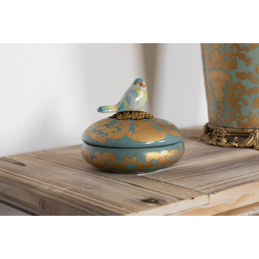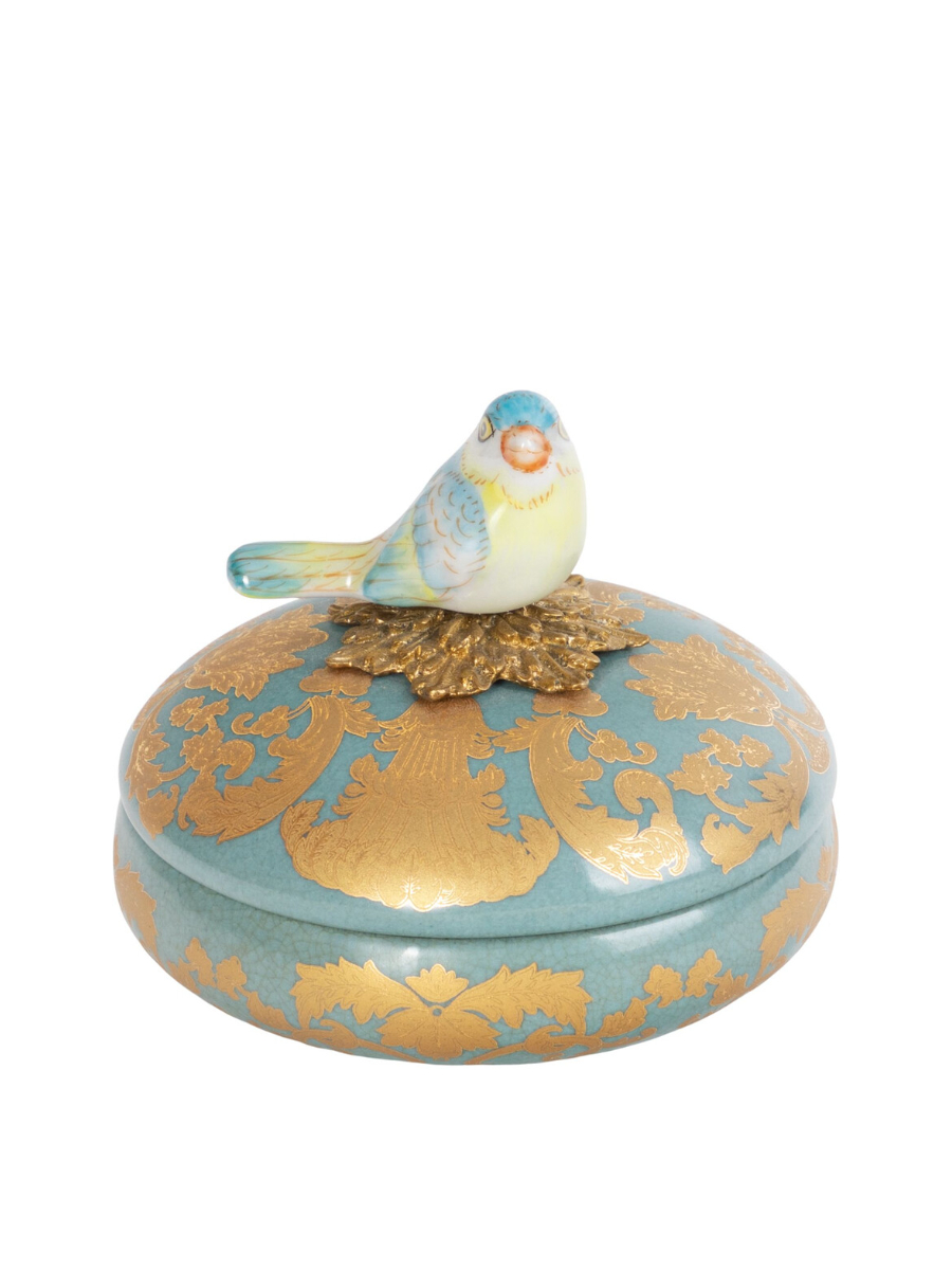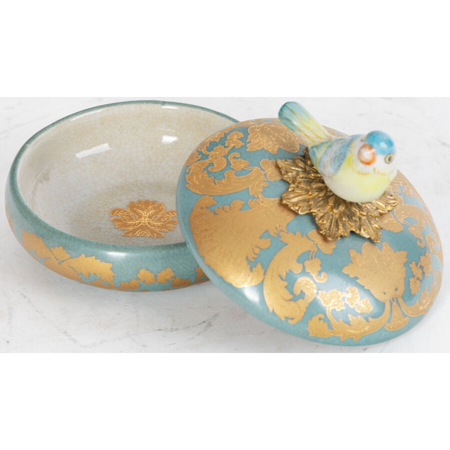 Шкатулка с птичкой, выполненная из фарфора с бронзовым элементом. Уникальное изделие ручной работы. При производстве этих художественных изделий из фарфора с бронзой используются вековые традиции китайских мастеров. Видимые трещинки (кракелюры) делаются по уникальной технологии, что придает более благородный вид старинного изделия.