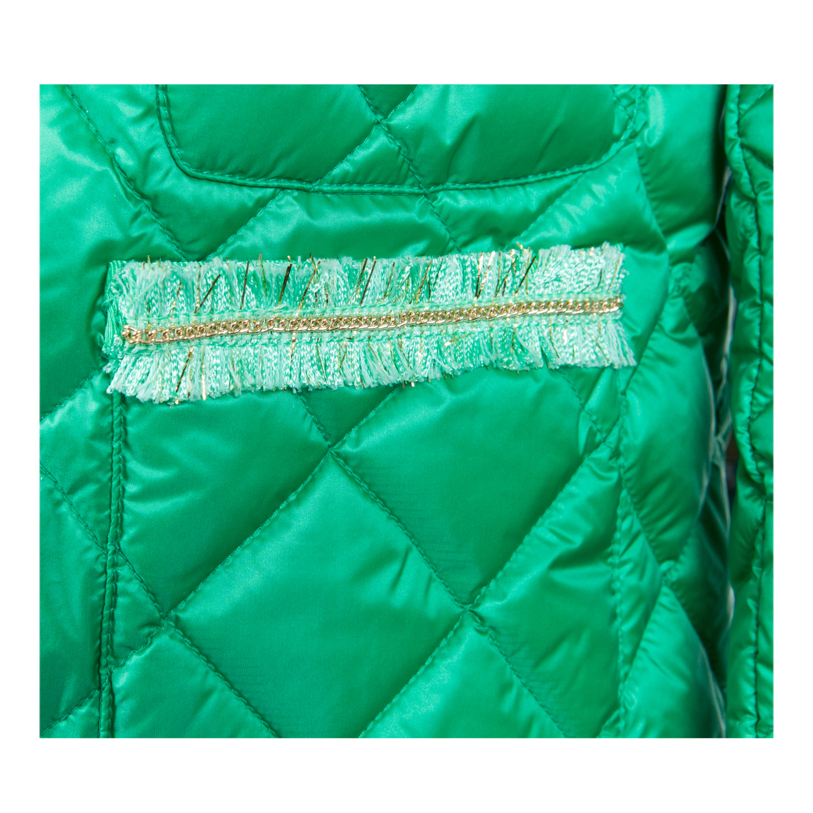Короткая куртка с круглым воротом из стеганого атласа с мягкой подкладкой. Отделки с контрастными тесемками. Переднее крепление с крюками металла. Накладные карманы спереди.