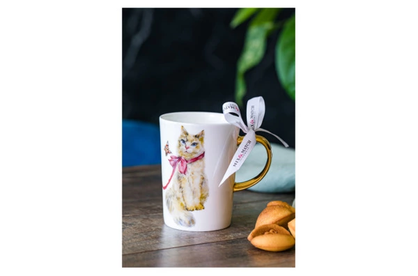Кружка «Кошка-милашка» с символом наступающего года от британского бренда Mix&Match станет отличным подарком на праздники. Она украшена красивой атласной лентой. Золотистая ручка выгодно оттеняет благородную белизну фарфора, подсвечивая его и придавая особый шарм. Благодаря объему 450 мл и конической форме, изделие идеально подходит для сервировки чая или кофе.