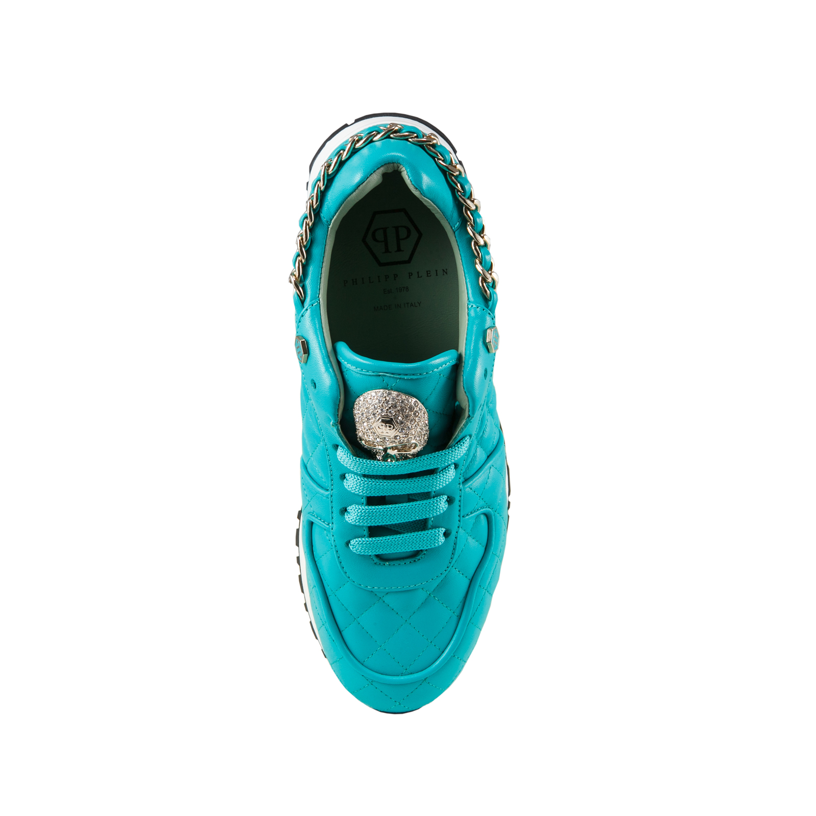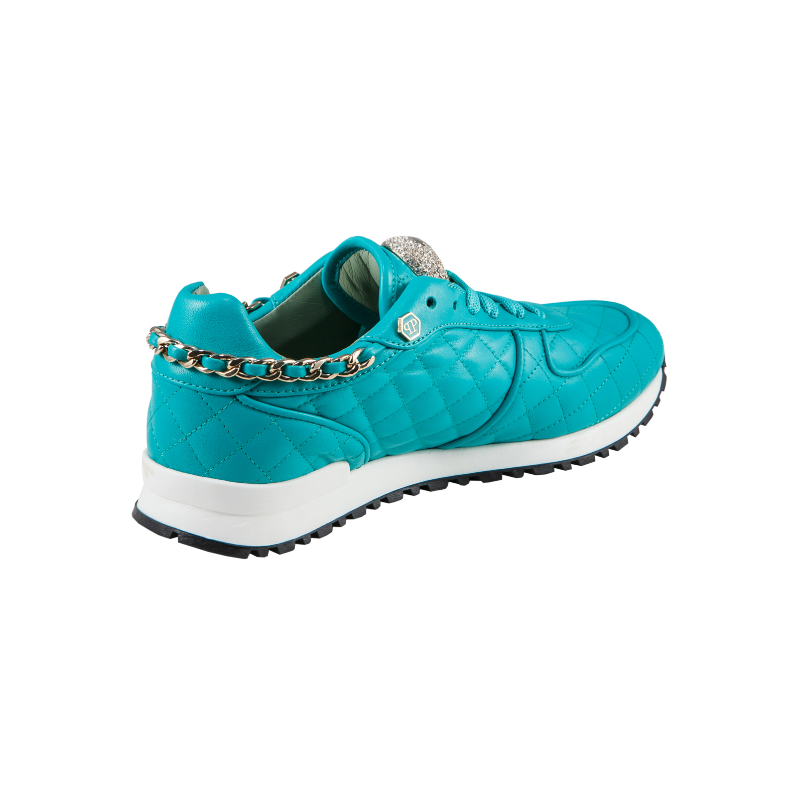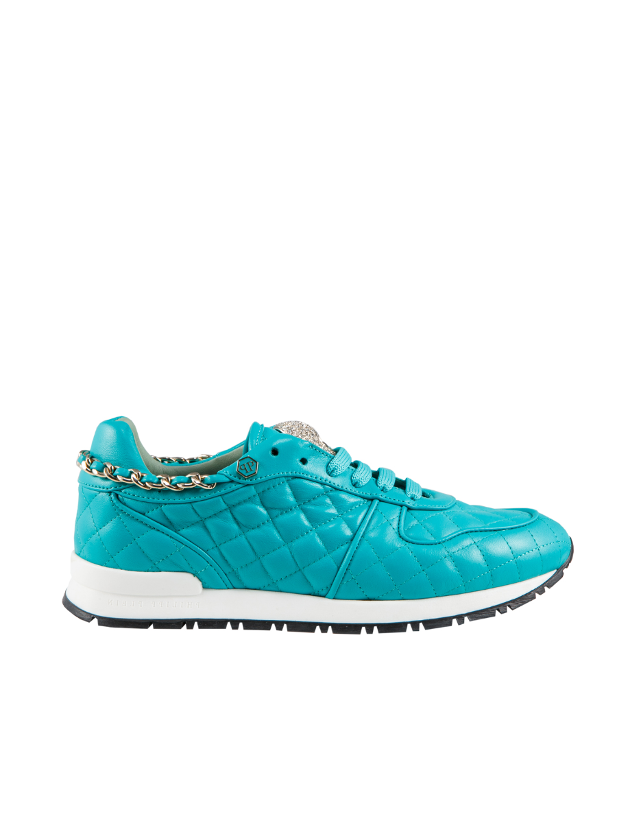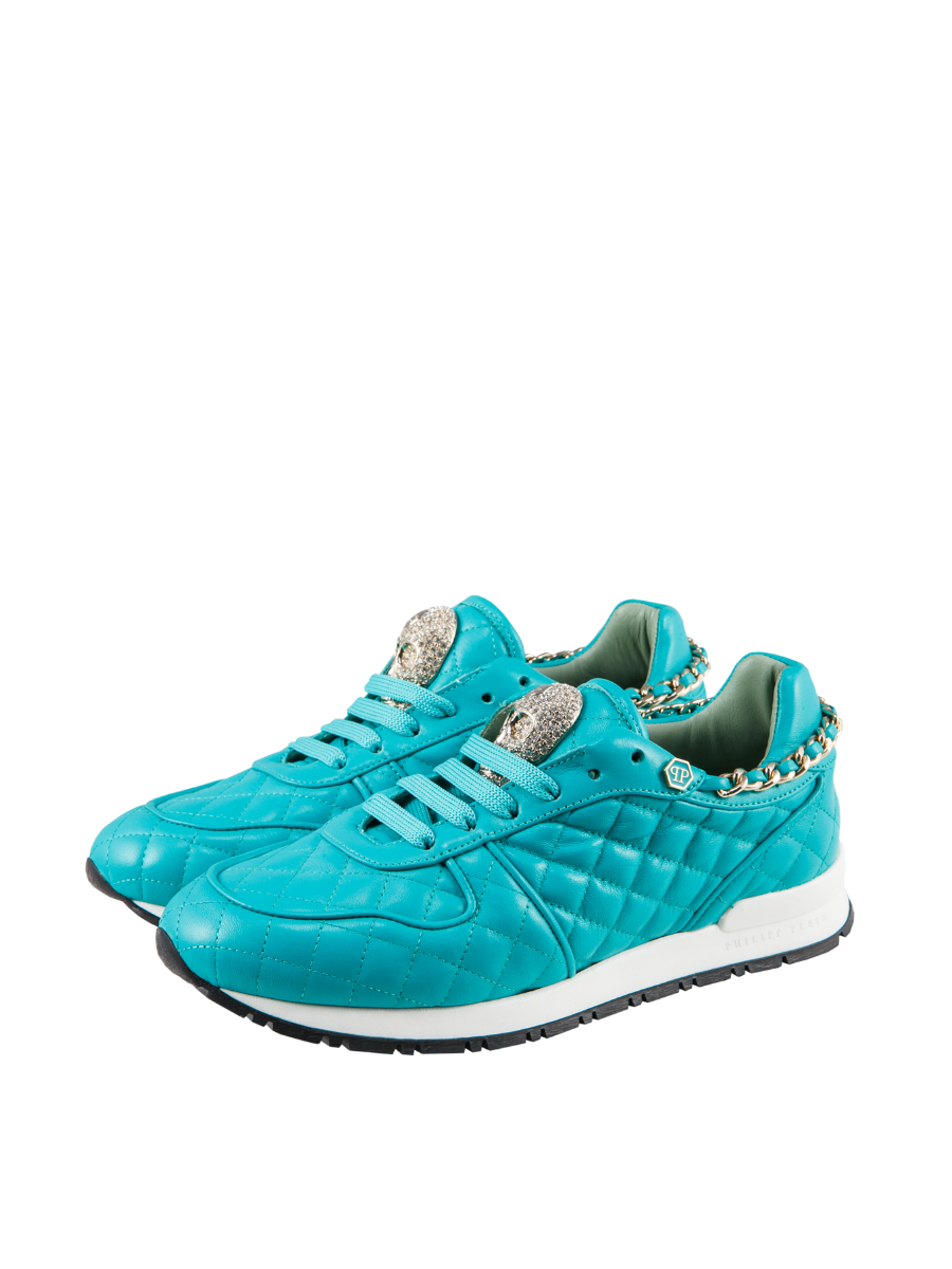 Кроссовки из натуральной кожи на шнуровке, на язычке - аппликация в виде черепа, выполненная из сверкающих прозрачных кристаллов. Фирменная стелька, задник декорирован метализированной цепочкой. В комплекте чехол для сезонного хранения и фирменная коробка.