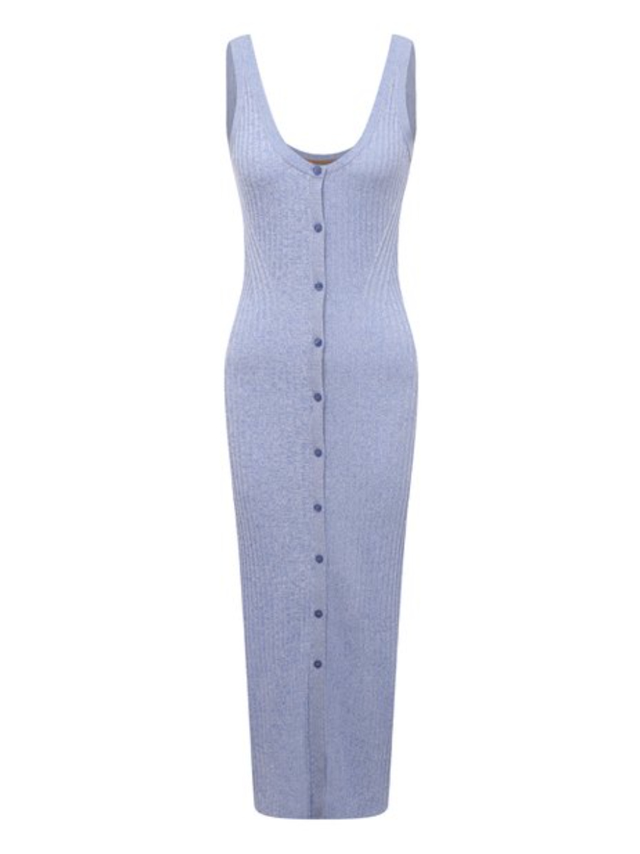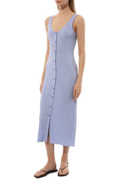 Голубое миди-платье с глубоким декольте, которому вторит вырез сзади, мастера марки, основанной Хуго Фердинандом Боссом, выполнили из мягкого трикотажа с фактурным полосатым мотивом. Материал изготовили из хлопка и шелковистой вискозы, произведенной из древесины, полученной из возобновляемых лесов. Роль акцента отдали пуговичной планке спереди, которая визуально вытягивает силуэт.