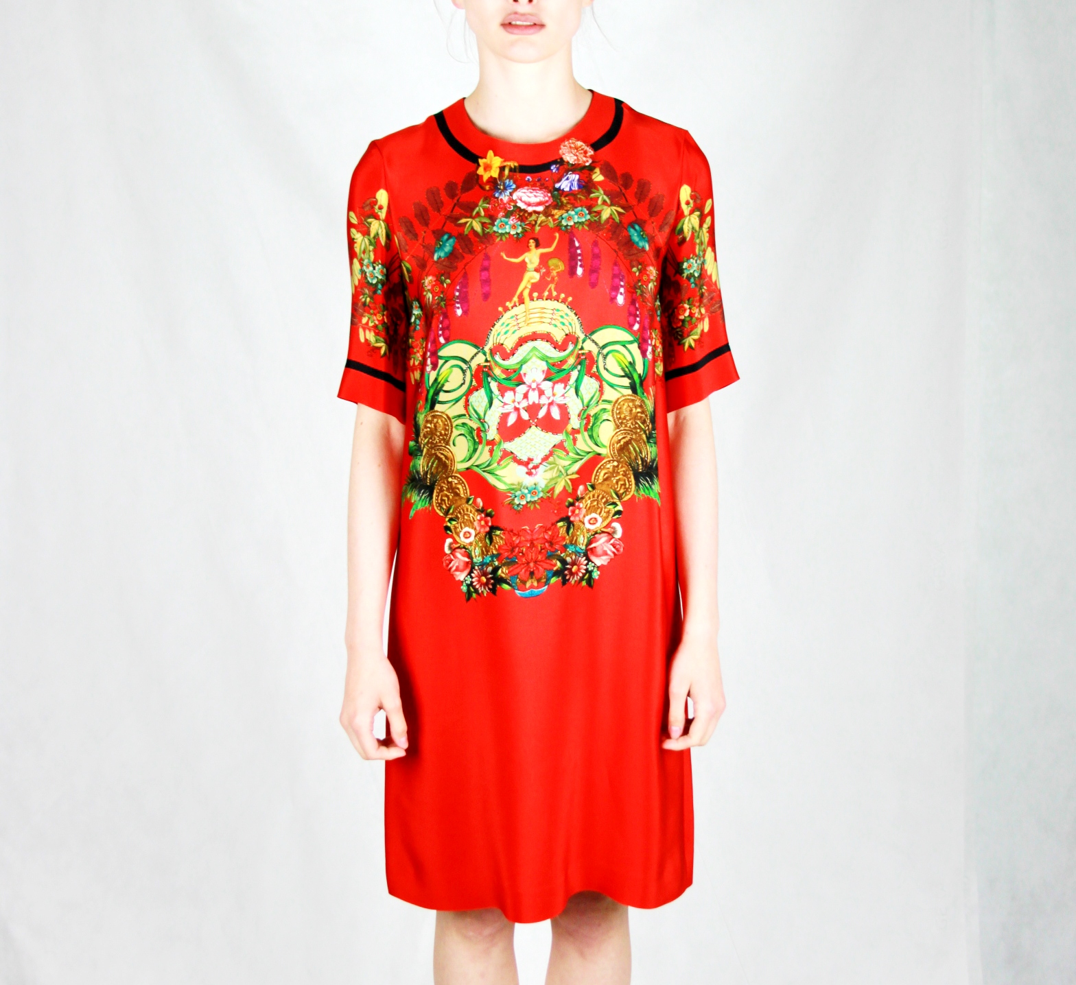 Платье женское длины миди с коротким рукавом. Круглый вырез горловины,без подкладки, молния и застежка на крючок сзади.