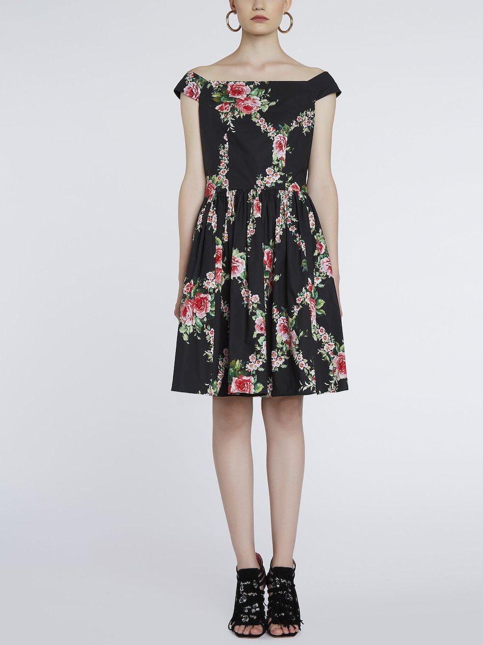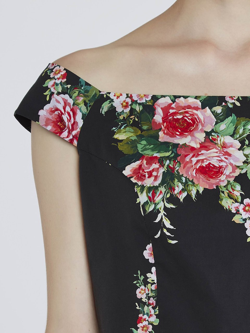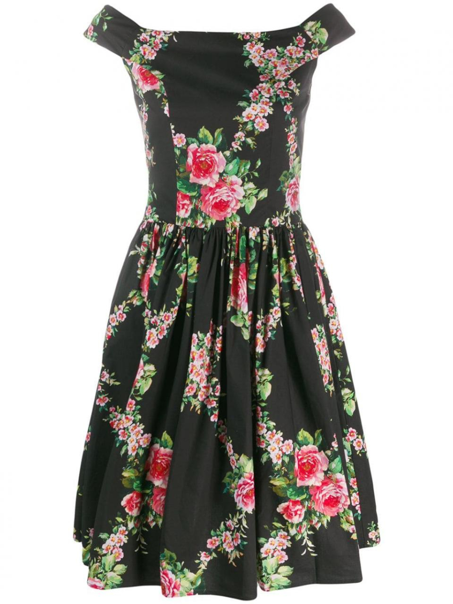 Платье из хлопка с принтом 'rose check', большим вырезом, открытыми плечами и рукавами-крылышками. Широкий подол в стиле 50-х годов со сборками в талии и потайной молнией сзади.