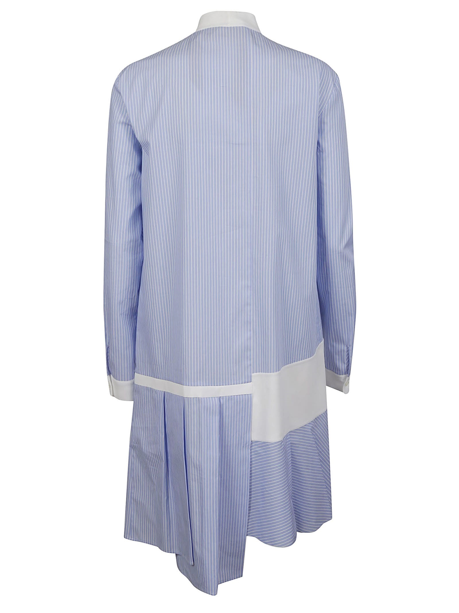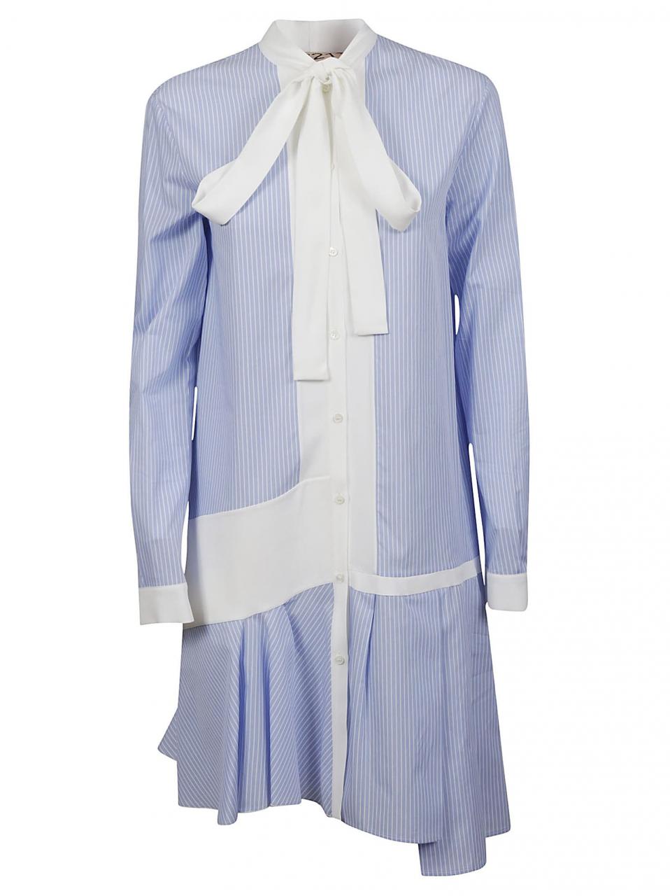 Платье-рубашка в полоску с бантом от Nº21. Завязка на бант, полосатый узор, застежка на пуговицах спереди, асимметричный крой, длинные рукава, манжеты на пуговицах, средней длины и асимметричный подол.