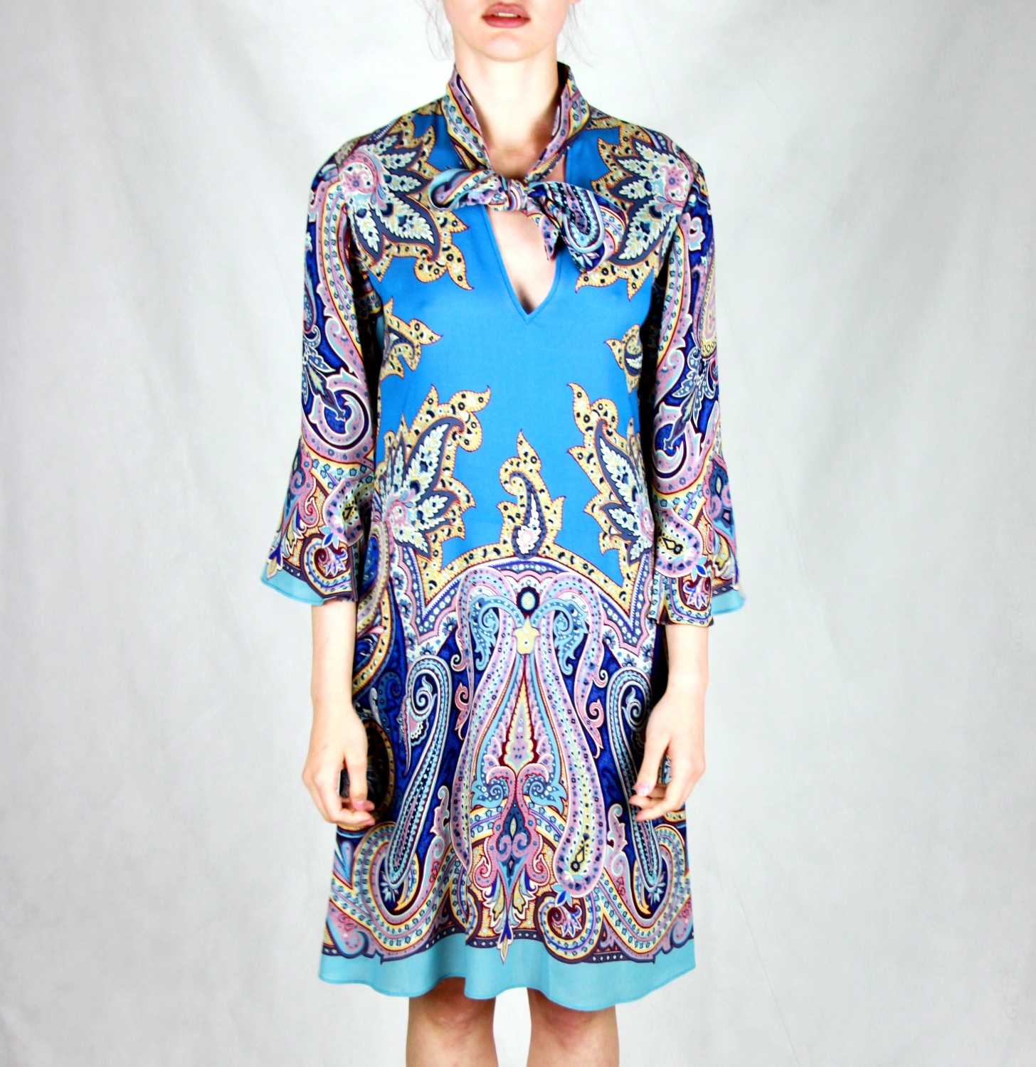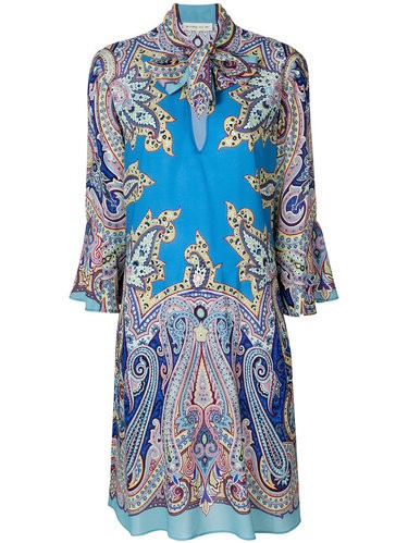 Синее платье шифт с принтом пейсли от Etro. Воротник-стойка с бантом спереди, передний разрез, рукава три четверти, длина по колено.