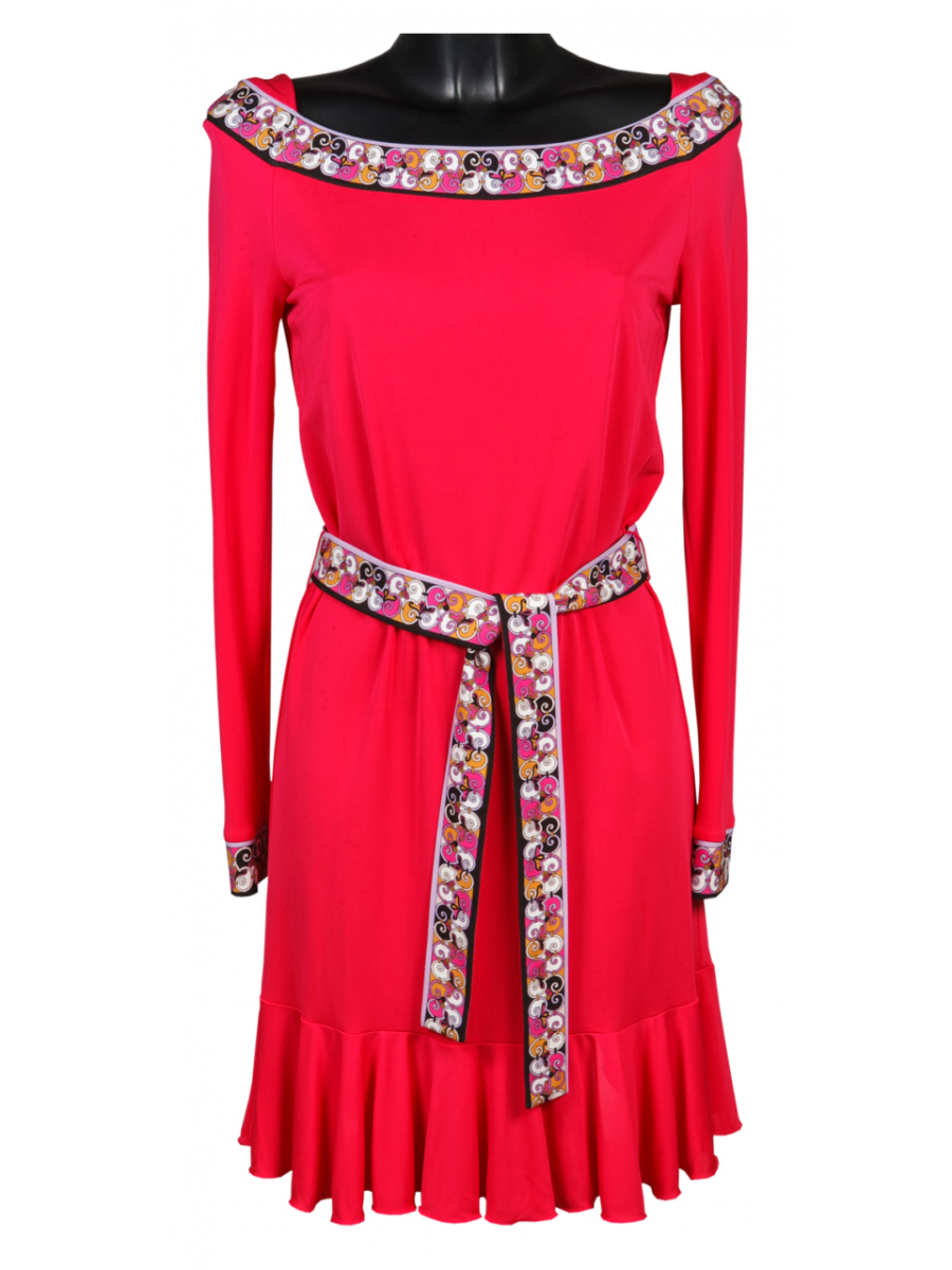 Платье женское прямого кроя с поясом, длина выше колена.