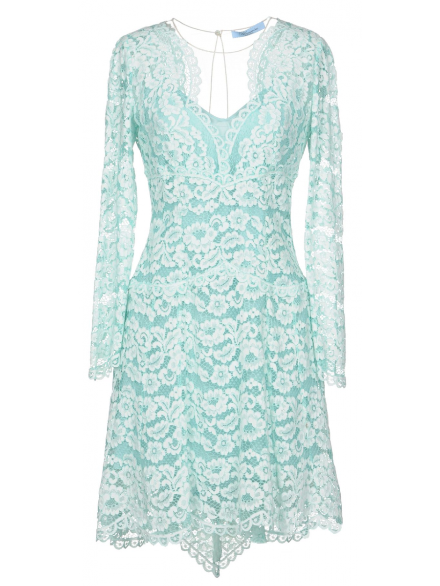 Приталенное укороченное женское платье с расклешенным подолом. Глубокий V- образный вырез отделанный прозрачной сеткой. Съемная сорочка из шелка. Длина изделия 96 см.