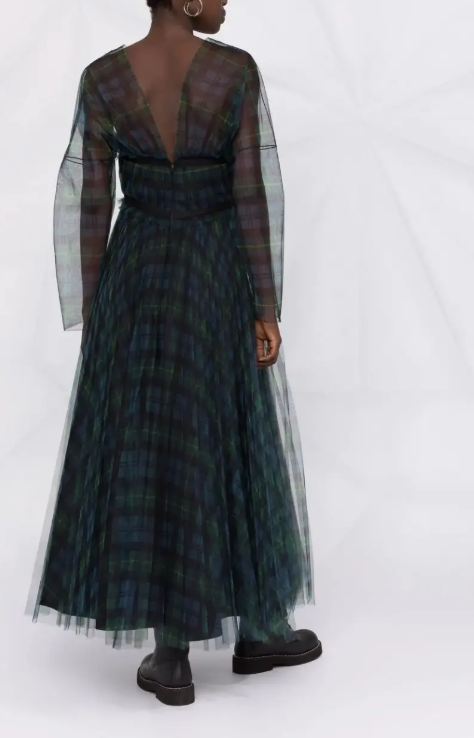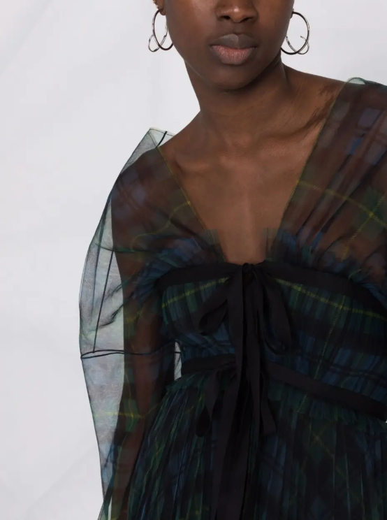 Принт в клетку тартан, верхний слой из тюля, V-образный вырез, прозрачные рукава , завязки спереди и расклешенный крой. Состав: Полиэстер 100%, подкладка: Хлопок 100%.