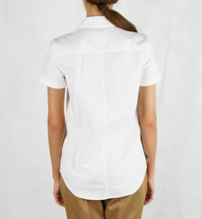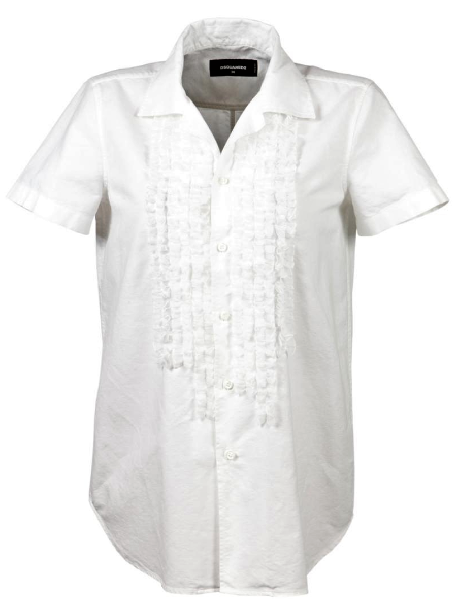 Хлопковая рубашка с коротким рукавом. Перед украшен фактурной манишкой из узких вертикальных оборок.