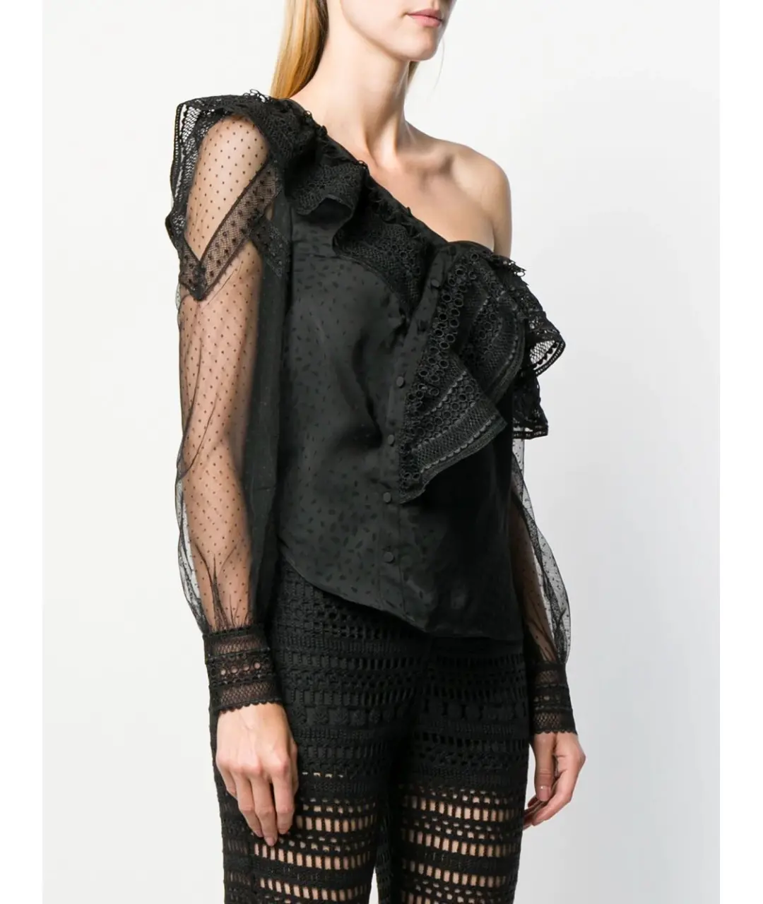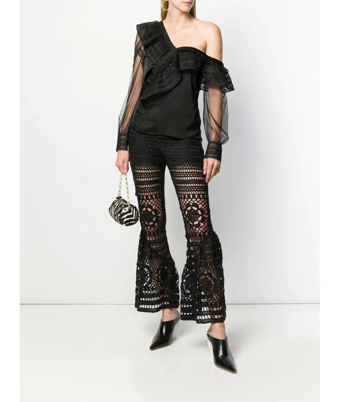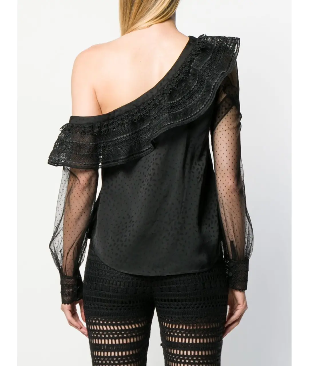 Кружевная блузка с открытыми плечами от Self-Portrait. Отделка с гофром, асимметричная горловина, длинные прозрачные рукава, узкие манжеты, закругленный подол и модель со спущенными плечами. Цвет: черный. Размер: 6 (UK) - 44 (RU).