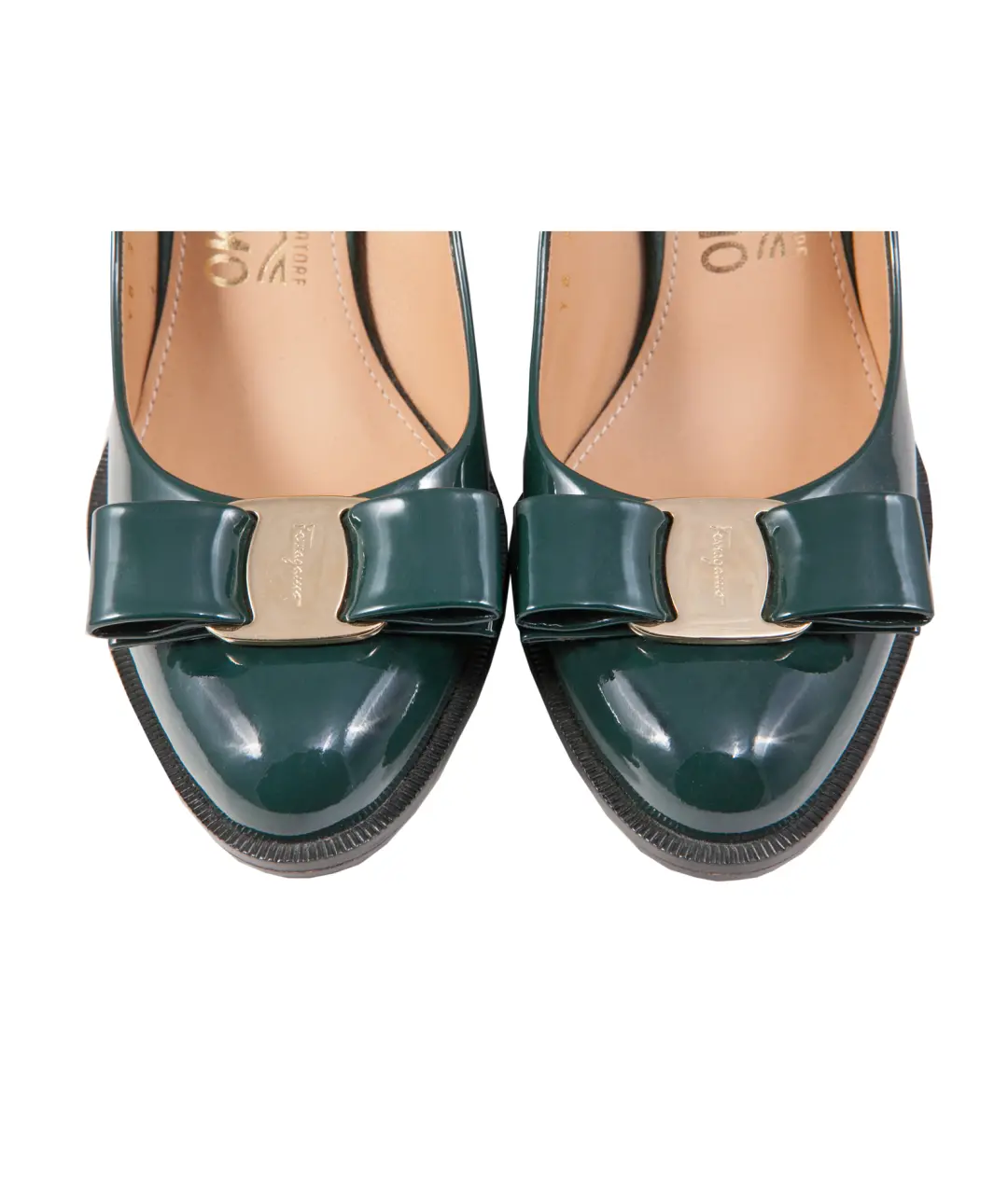 Туфли женские, верх из натуральной лакированной кожи, овальный нос с бантом-пряжкой, прямой каблук высотой 10см, высота подошвы 1см.
