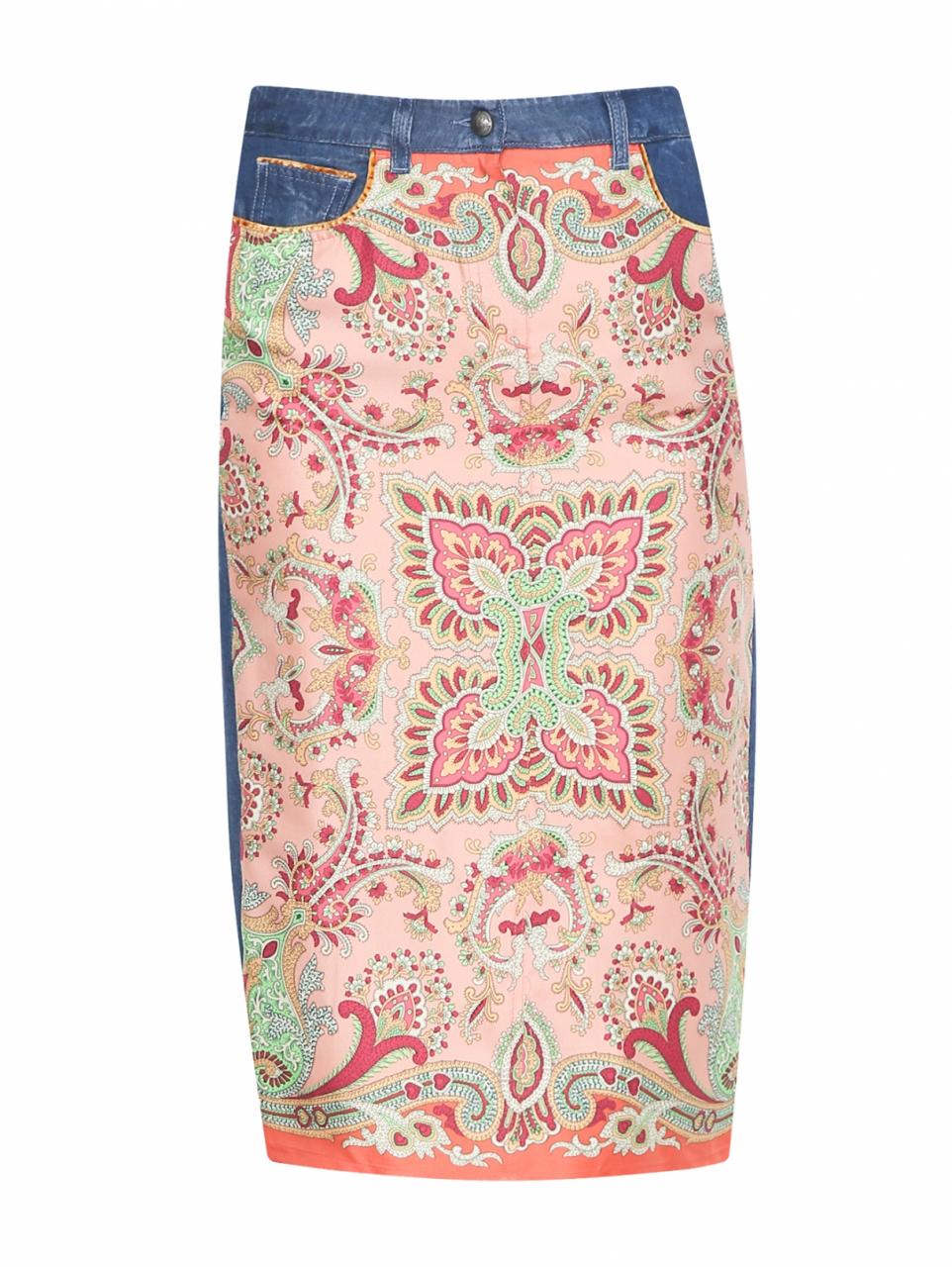 Оригинальная юбка от Etro выполнена из комбинированного шелка — ее лицевая сторона украшена этническим принтом, а задняя внешне напоминает темный деним.